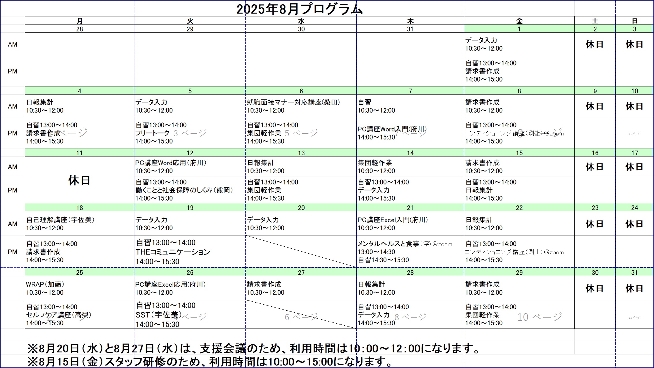 お知らせ 2025年8月のプログラム表を掲載します。 2025.08.08 ※ 気になるプログラムがございましたら、各事業所までお問い合わせをお願い致します。 平塚センター 在宅訓練用プログラム Tweet Share 2025年7月のプログラム表を掲載します。 2025年9月のプログラム表を掲載します。